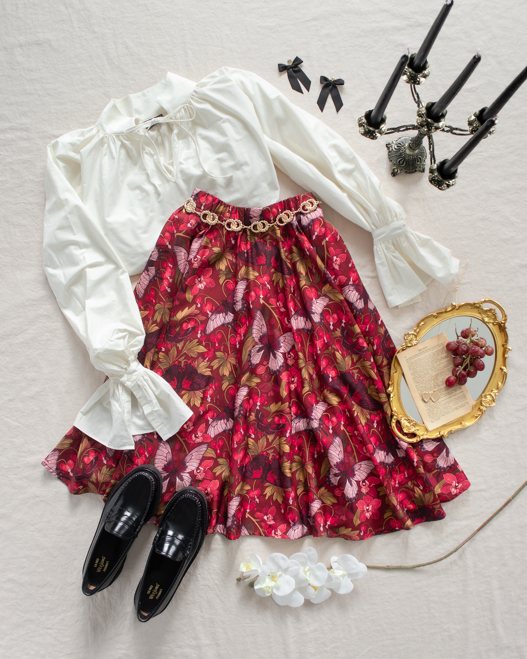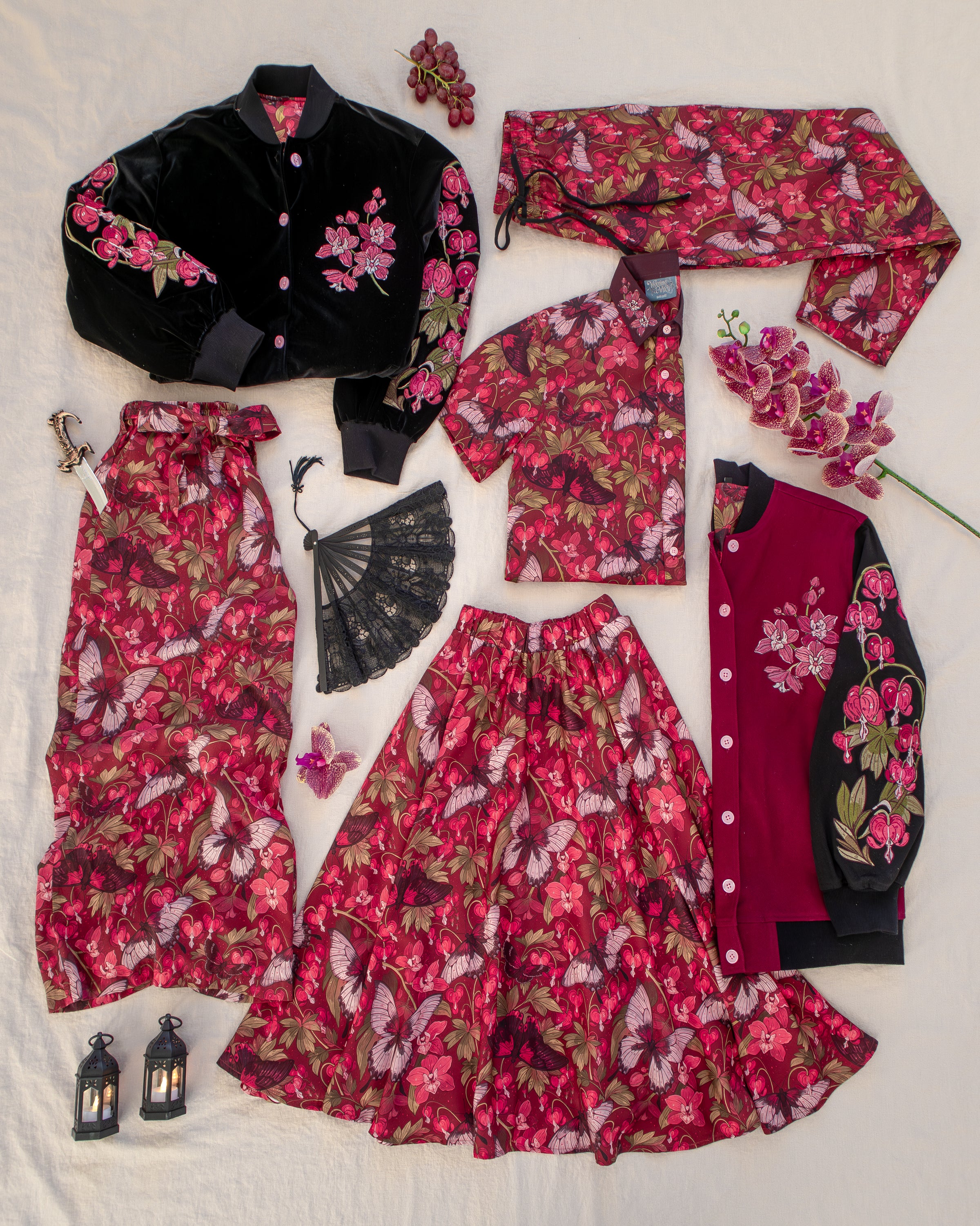 after almost a year in development, we're thrilled to finally launch the first installment of the Cordiform collection! this is a presale that includes: cotton twill and velvet jacket variants, printed button downs, printed culottes, trousers, and midi skirts.