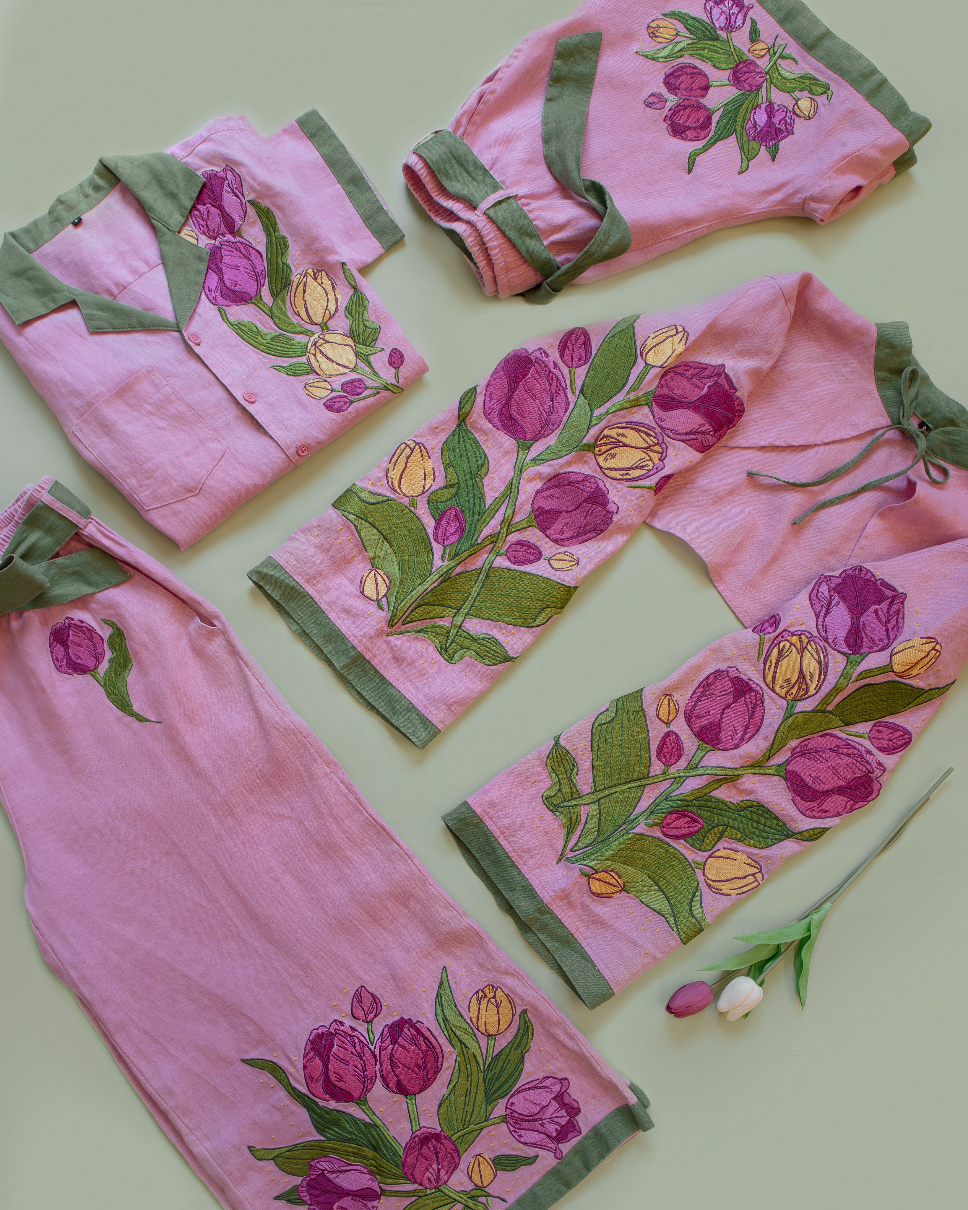 after almost a year in development, we're thrilled to finally launch the first installment of the Cordiform collection! this is a presale that includes: cotton twill and velvet jacket variants, printed button downs, printed culottes, trousers, and midi skirts.