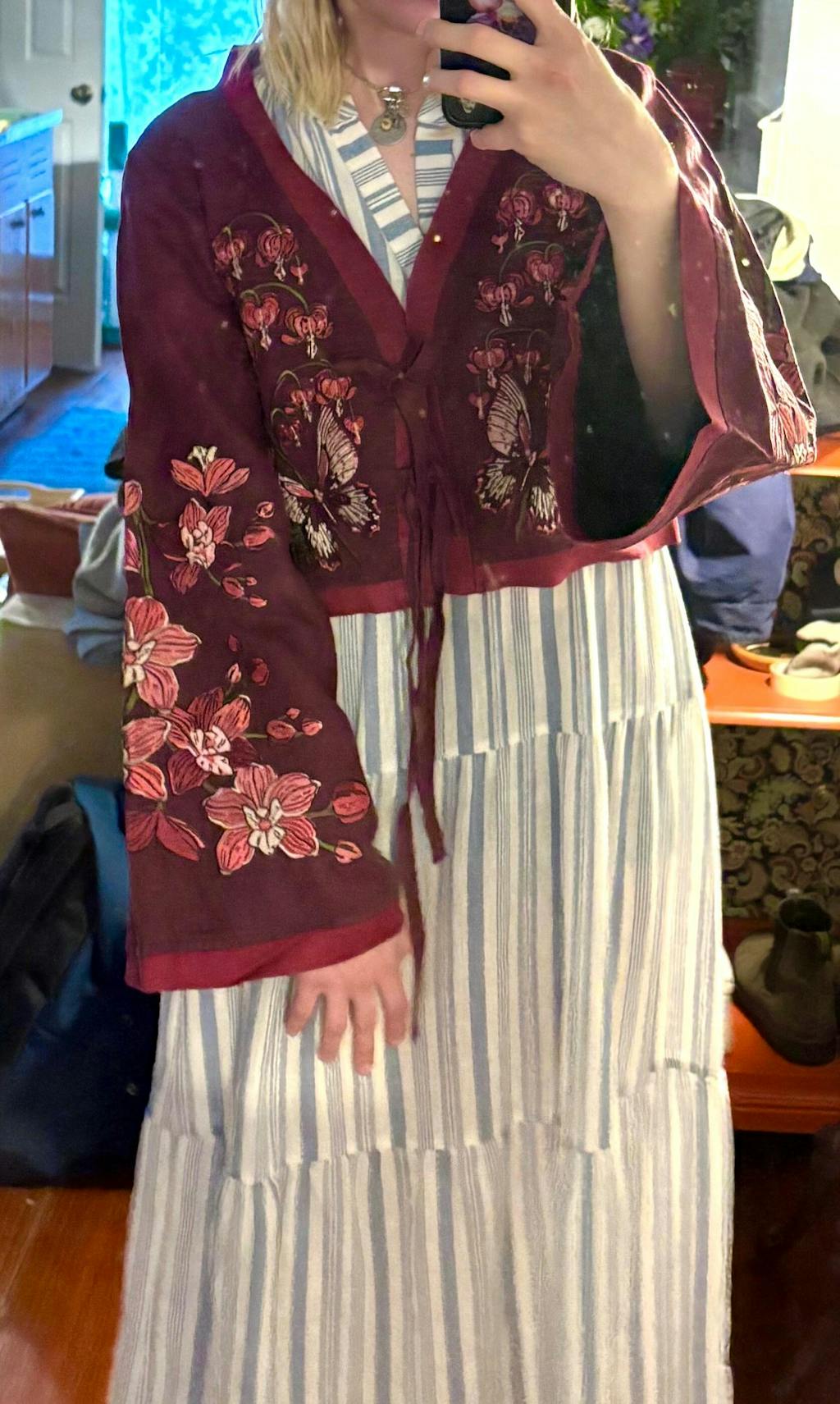 Loooove this piece so much!! It's so flattering and the embroidery is gorgeous and detailed. The sleeves in particular are a bit stiff (as noted in the description) but makes sense with the embroidery and actually adds some nice structure to the bell sleeves so they aren't just sliding around and getting in the way. Just something to be aware of! So stoked to have such an amazing piece in my possession 🌸 Especially for such a great price.
