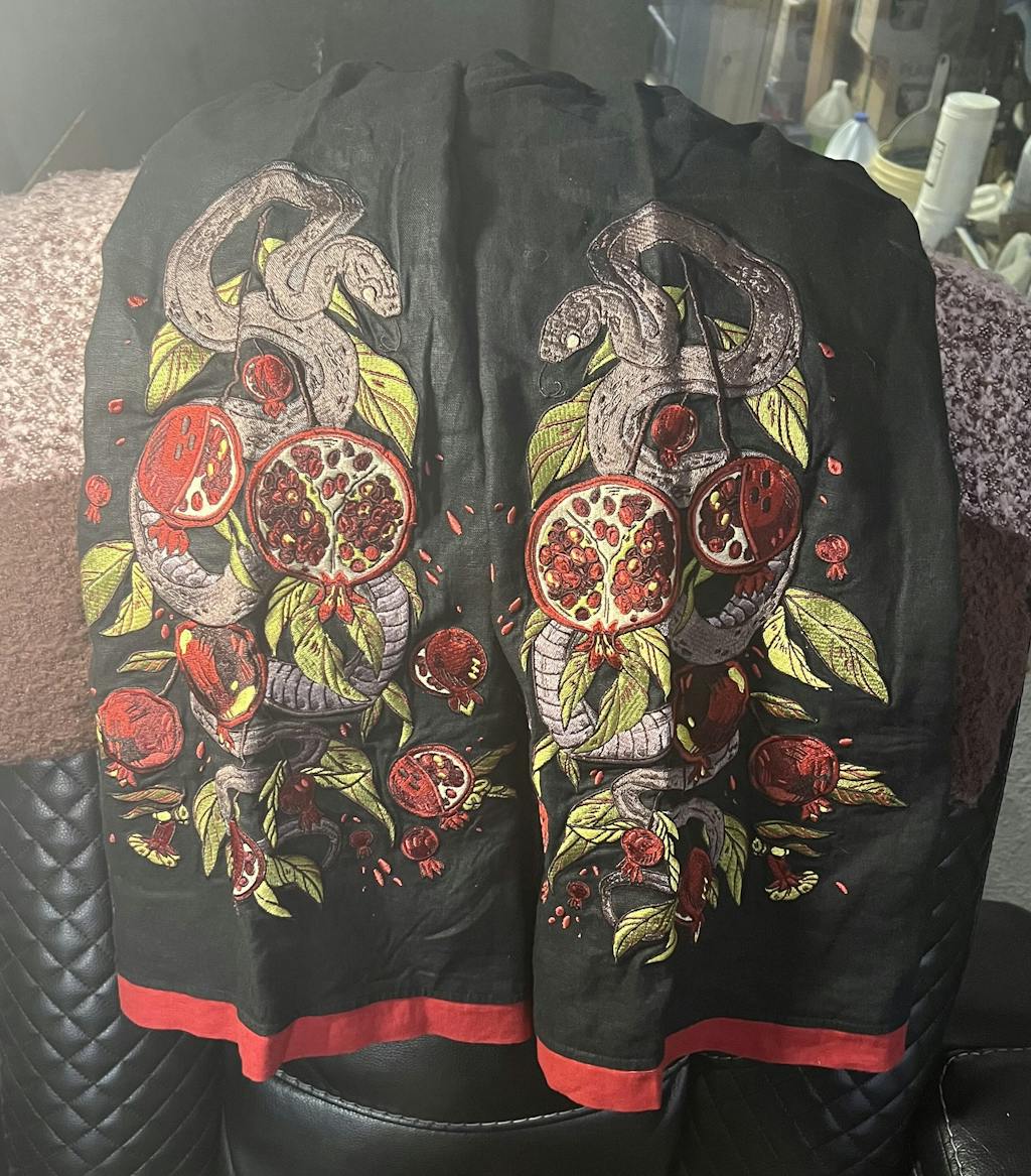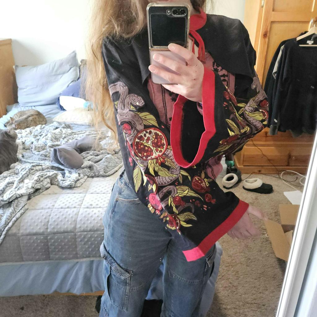 The linen boleros tie at the neck and have loose, dramatic sleeves. The arms are embroidered and have a tencel lining for comfort.