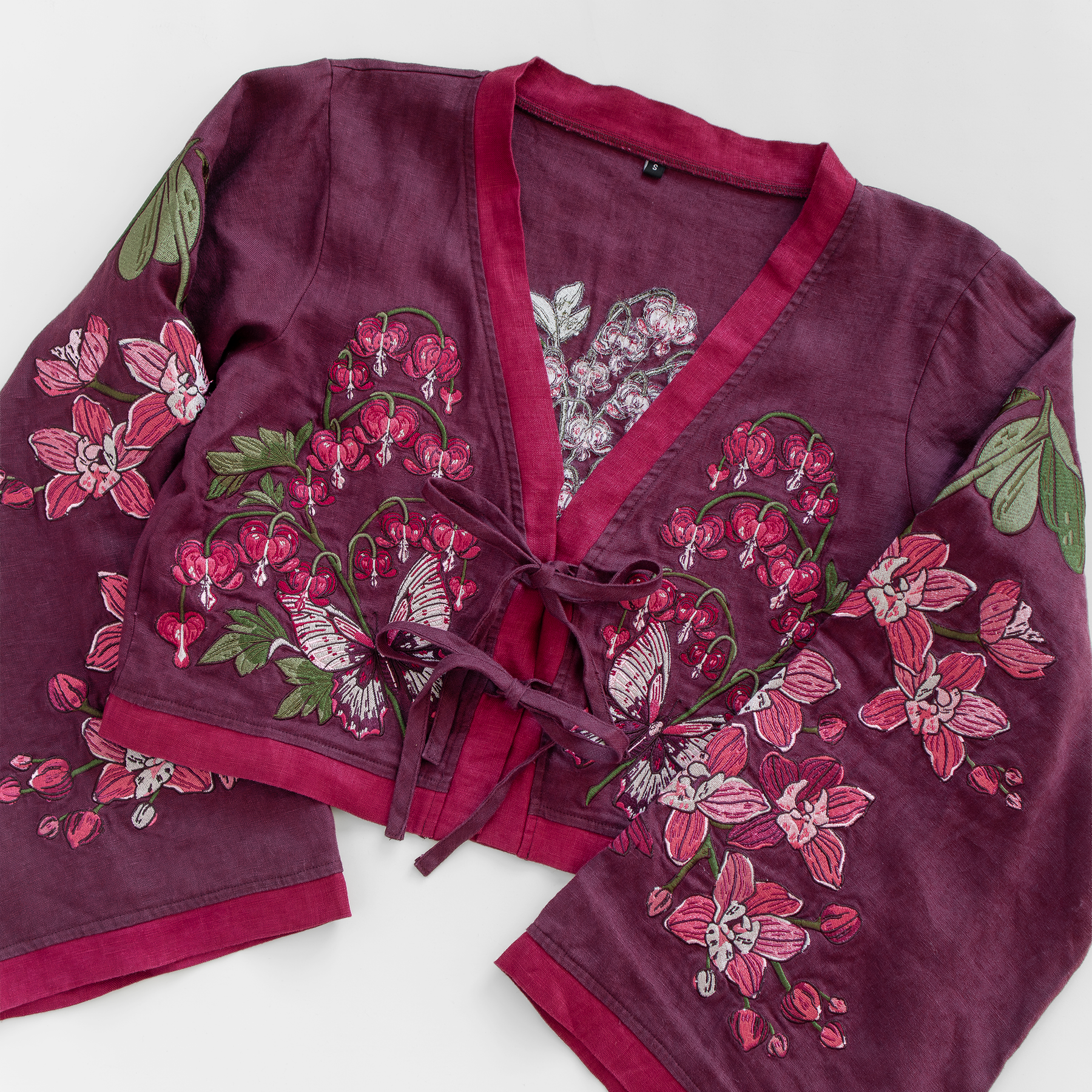 Cropped, front tie cardigans are made with 100% linen and feature 2 front ties, dramatic bell sleeves that are lined with 100% tencel and embroidery on the chest, arms and back.