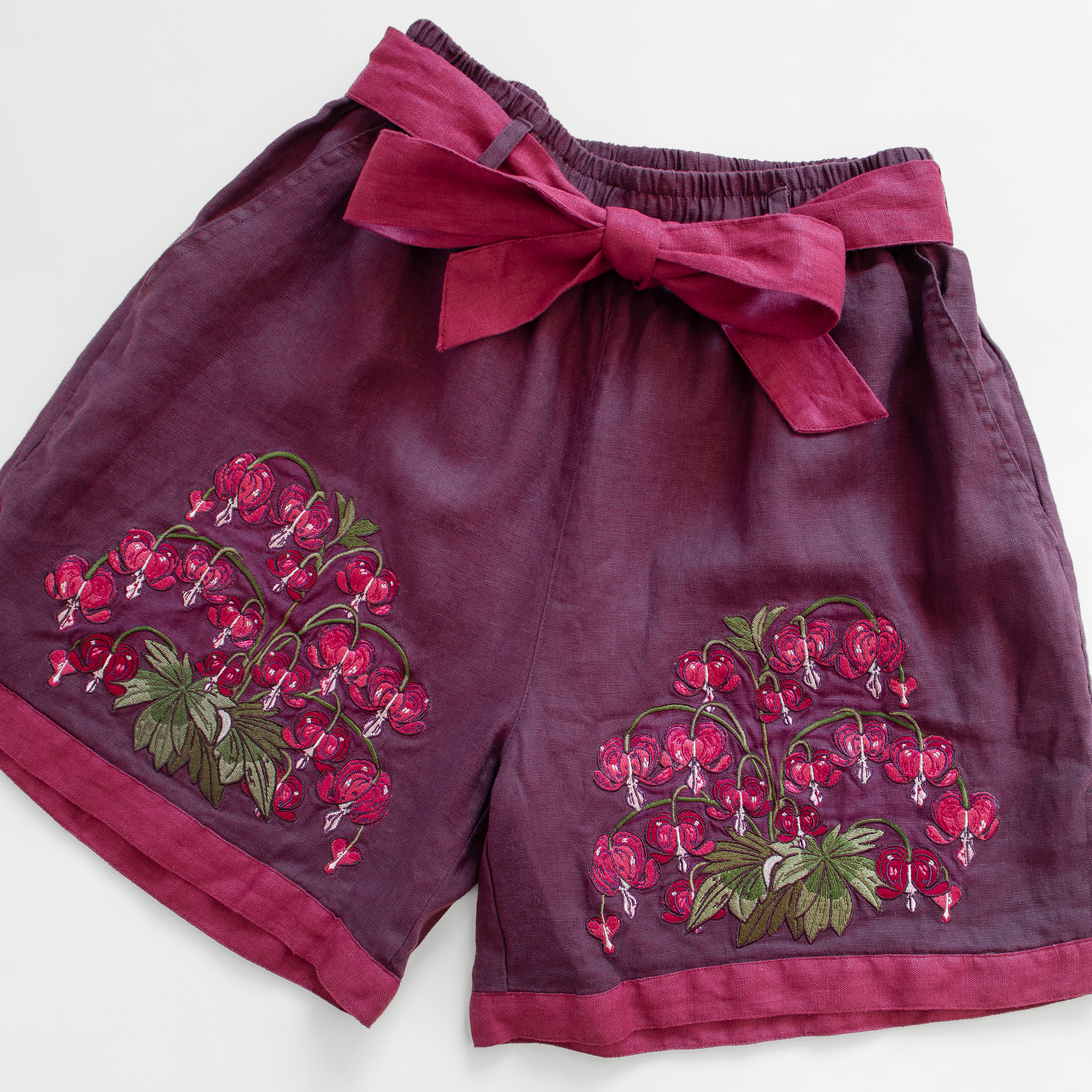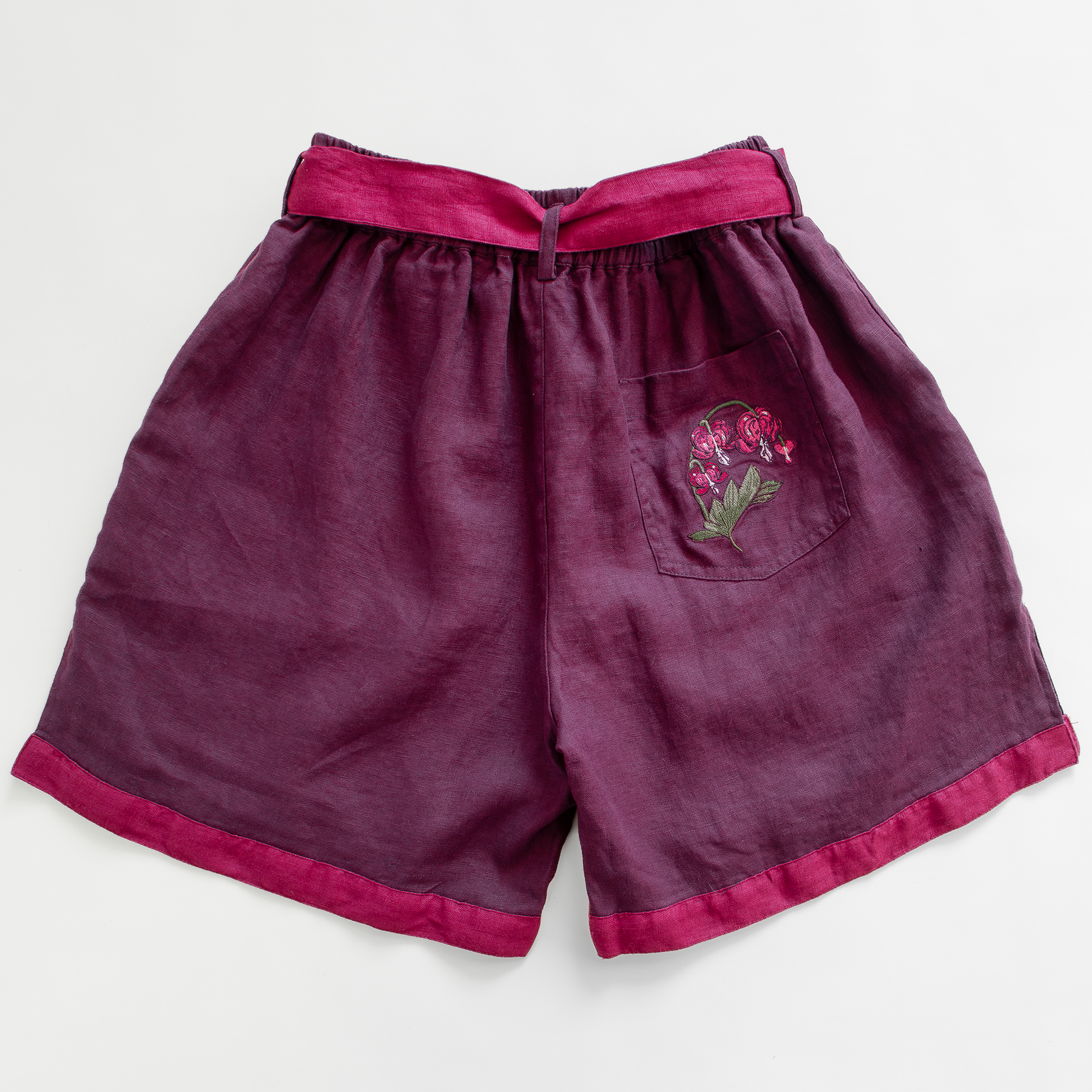 The linen shorts are fully lined for comfort. They feature an optional waist tie, pockets, slits up the sides of the thigh for extra room, and embroidery on the front. They can be worn high or low waisted based on preference (it may be recommended to size down if you wear your shorts lower on the hips.)