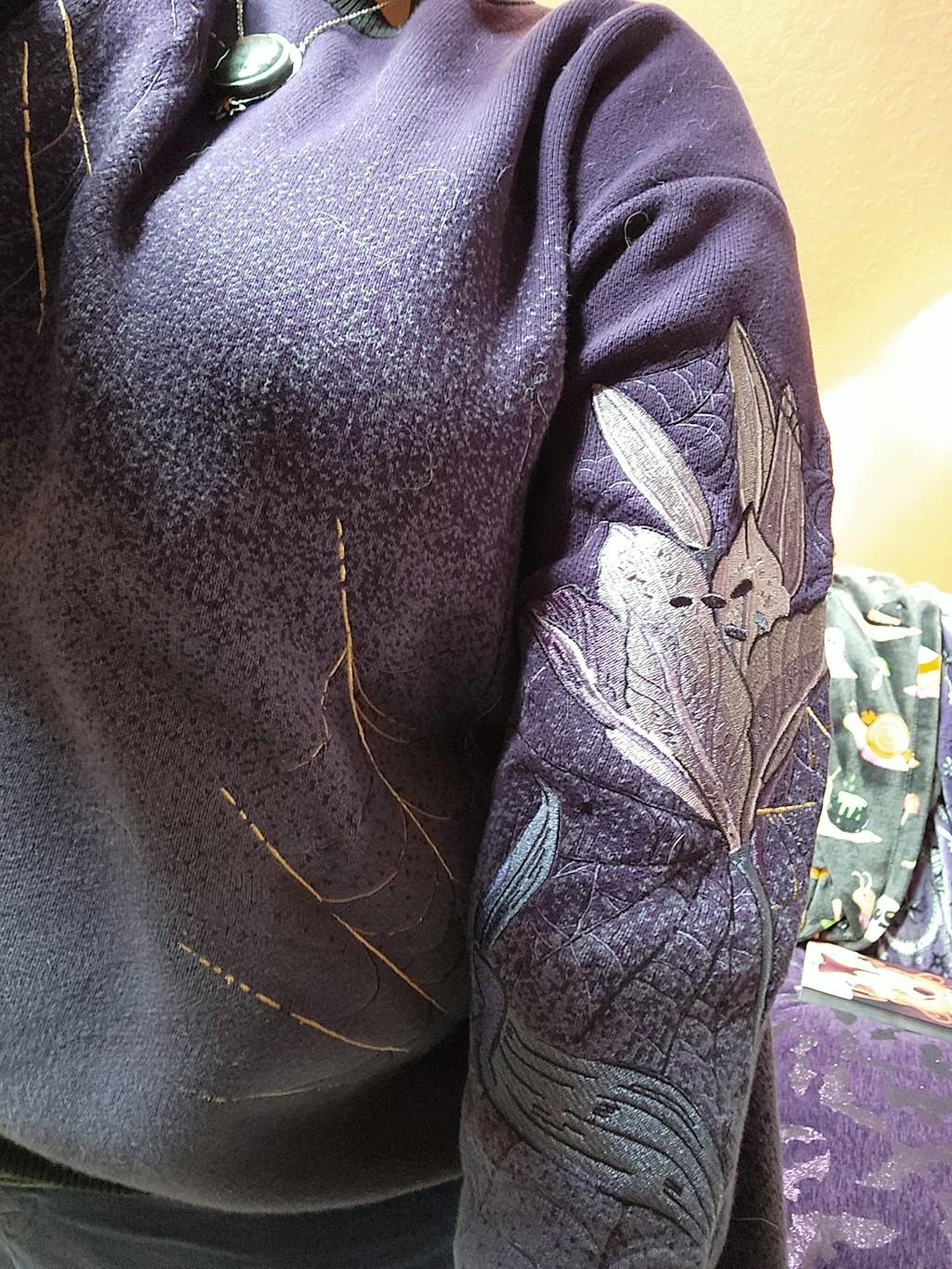 I love it! I used measurements from a close-fitting sweater but it's pleasantly loose. The quality feels great. My only gripe is the size and stiffness of the lilies on the sleeves, they're right at the height to fold when you bend your arm. The embroidery is fairly smooth on the back, though, so I don't feel compelled to wear long sleeves. The colors are slightly different from the pictures, I though the lighter color at the bottom was lavender but it's more of a muted blue but I like it more for it! I'm excited for more orbweaver designs.