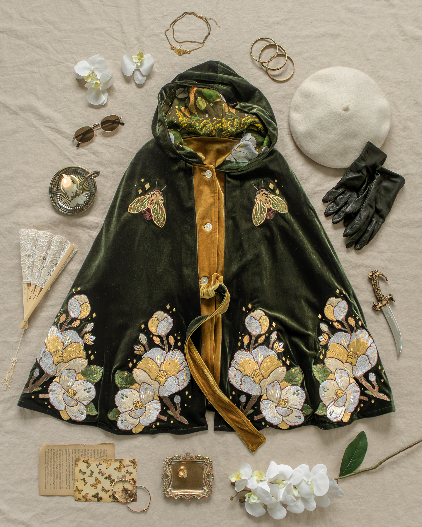 Add a little whimsy to your wardrobe with our cloaks! poly velvet exterior fabric, tencel inner lining. The outer cloak connects to an inner vest, which has button closure and zippered pockets. The outer cloak does not detach from the vest. Optional waist belt is included.