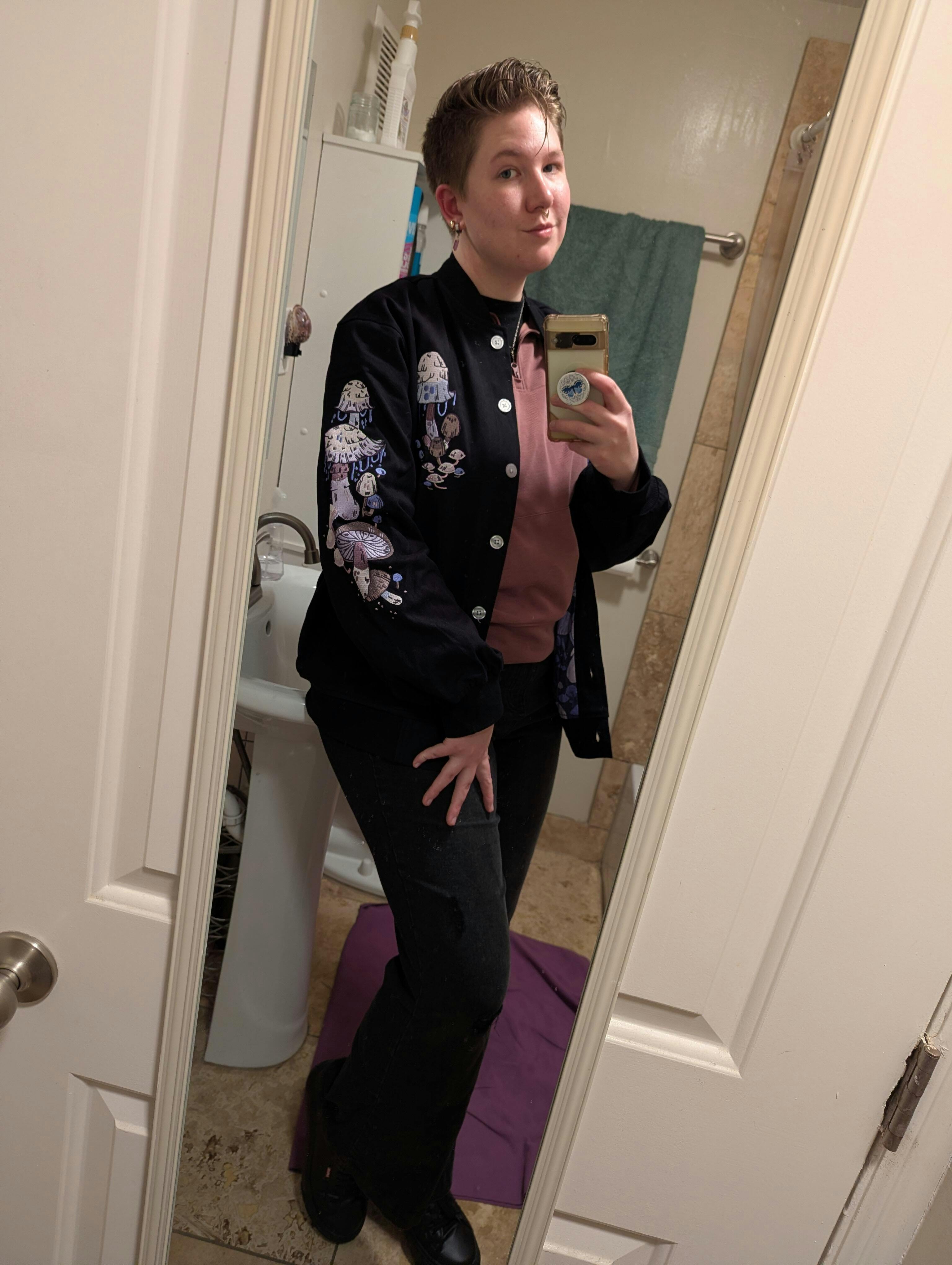 Cotton twill exterior with a 100% cotton interior, and embroidered detailing on the chest, back and sleeves! Cotton twill does not stretch. If you are on the upper end of a size, or own a velvet jacket and find that it is snug on you, you may have to size up.