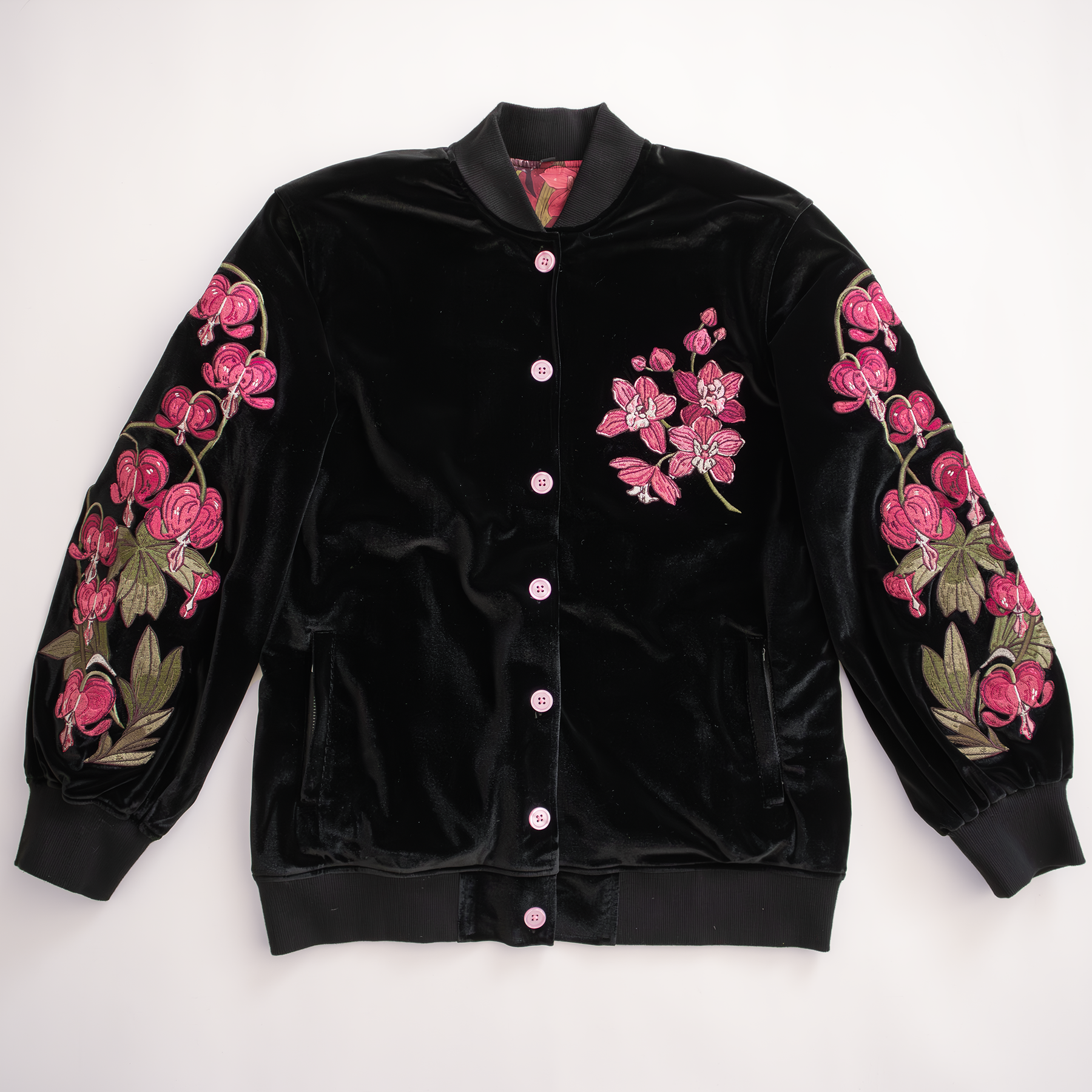 Black polyester velvet exterior with a 100% cotton interior, and embroidered detailing on the chest, back and sleeves!