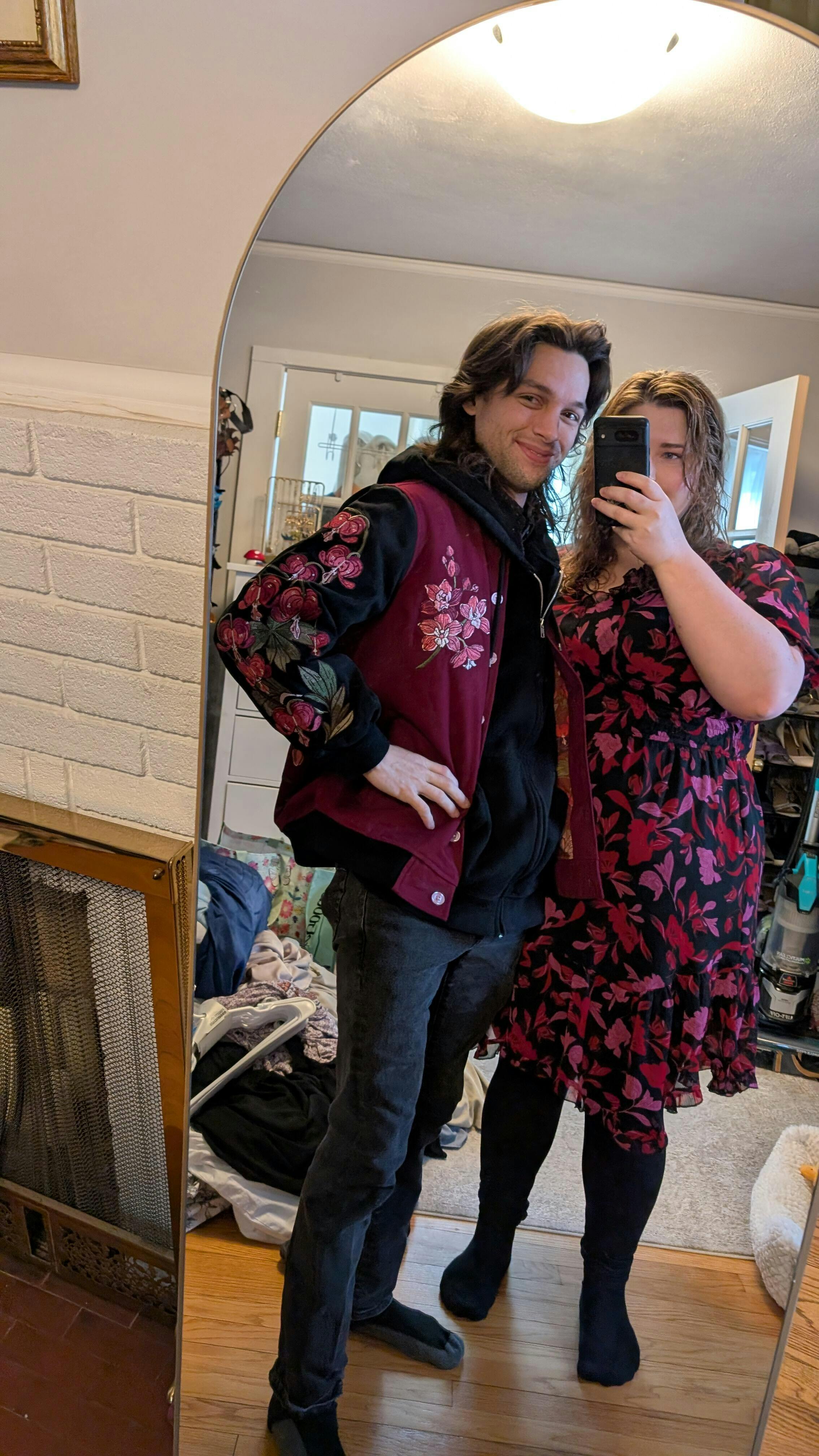 Cotton twill exterior with a 100% cotton interior, and embroidered detailing on the chest, back and sleeves! Cotton twill does not stretch. If you are on the upper end of a size, or own a velvet jacket and find that it is snug on you, you may have to size up.