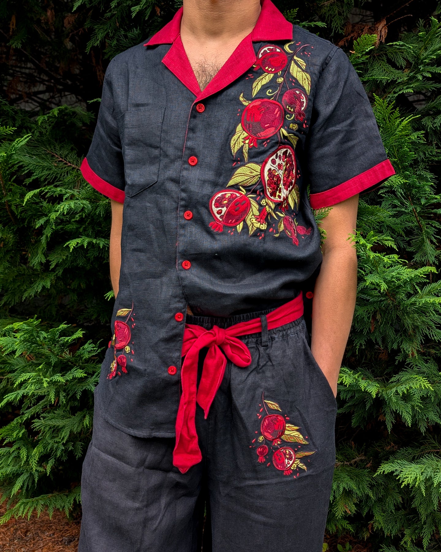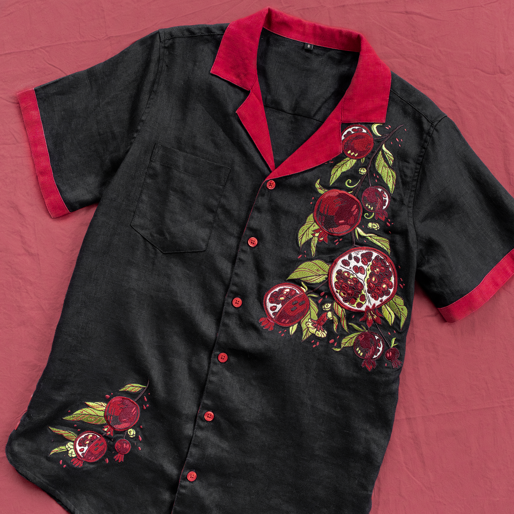 The linen button downs feature embroidery on the upper chest and bottom right hem, buttons for added hip room, and a tencel lining under the chest embroidery for comfort.