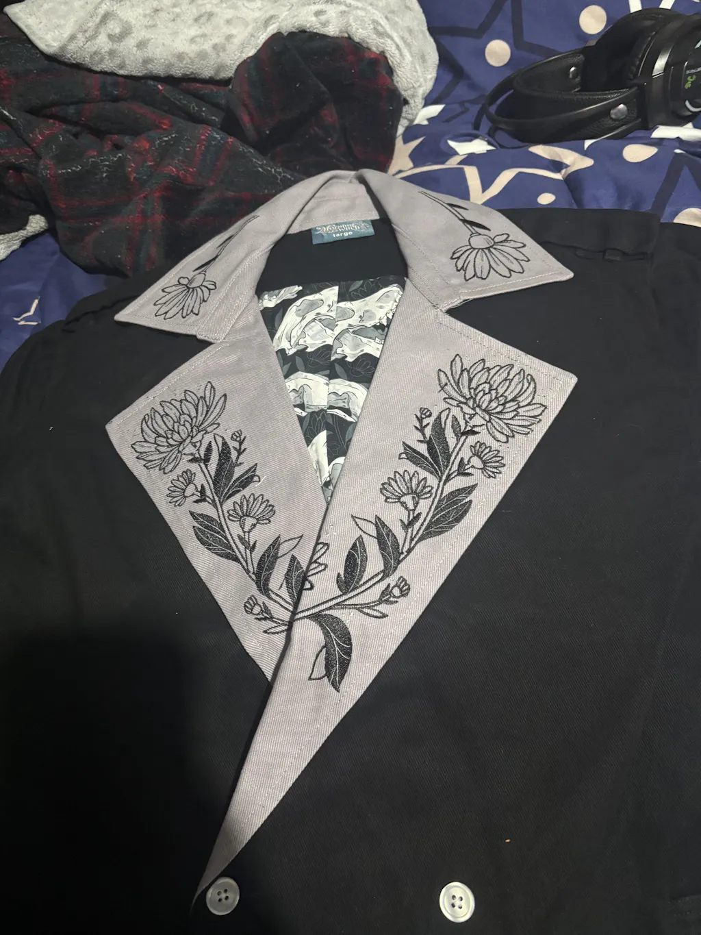 cotton twill exterior with a 100% cotton interior, and embroidered detailing! Cotton twill does not stretch. If you are on the upper end of a size,, you may have to size up.